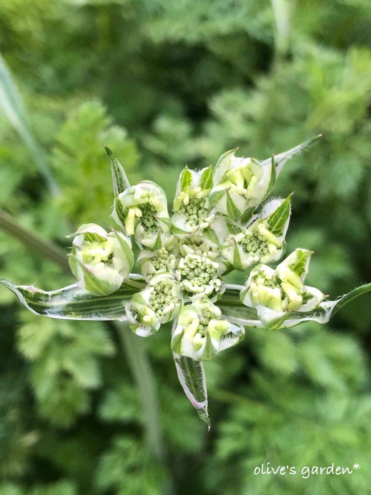 白い花が集まってレースの様な可愛いオルレアがもうすぐ咲きそう🌼イカイガの種からは想像も出来ない清楚な感じが好きで毎年種から育てます❤︎