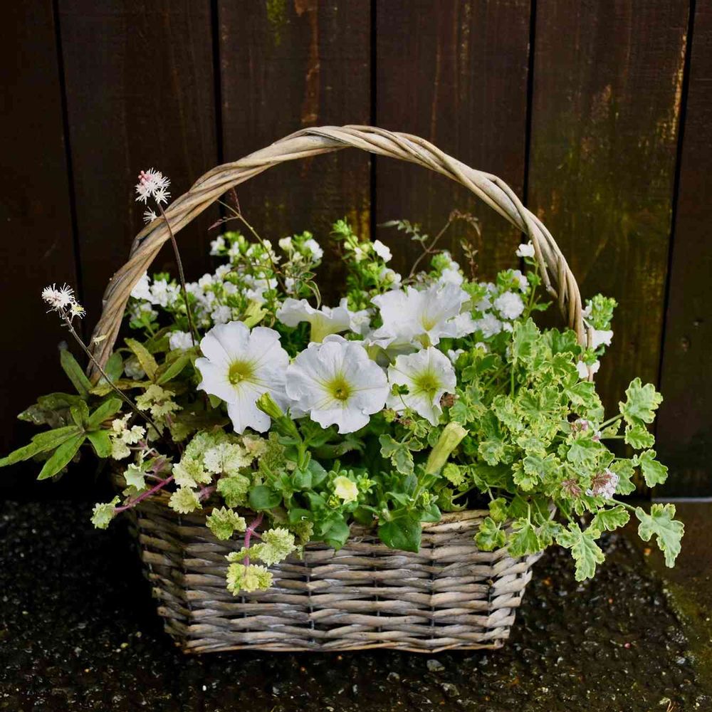 ペチュニア、ティアレア、ナツメグゼラニウム、ハゴロモジャスミン、グレコマ、バコパ