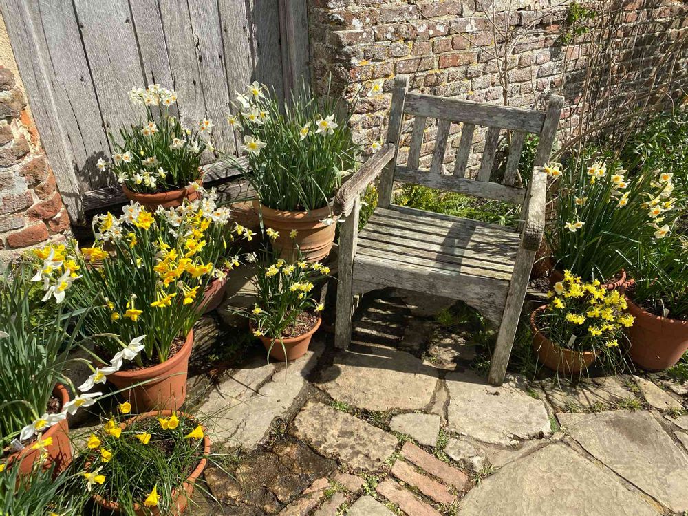 ミニチュアのイスと、黄色と白のお花の植木鉢がおしゃれ可愛い💕