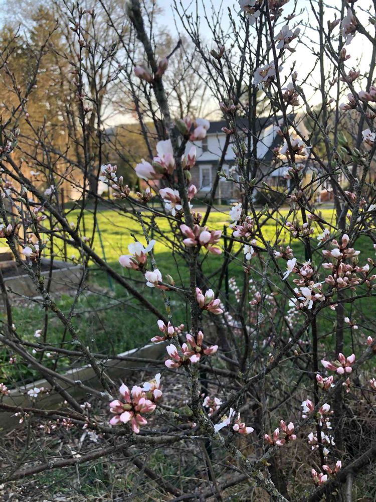 10年ほど前に南京桜だよってジョンという人にいただきました。図書館に飾ってあった生け花を見て、感動してくださったそうです。きれいな花が咲くからと人差し指ほどの苗木を2本いただいたのです。立派になりました。実も食べられます。小梅と似ています。