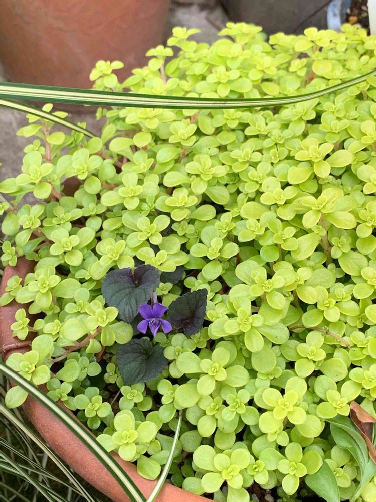 雑草に近いセダムに占拠された鉢のあいだから、小さなビオラ ラブラドリカが顔を出しています☺️生命力を感じます✨