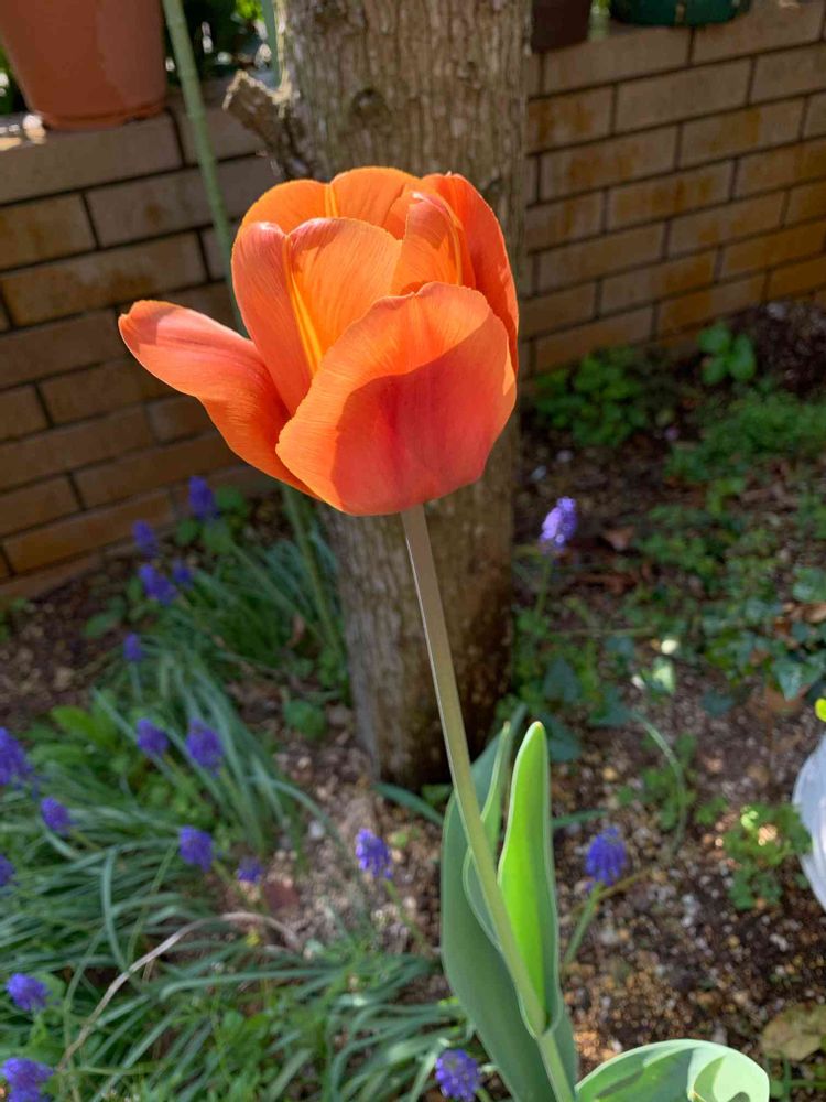 ずーっと、土しかなかったのに、4月に入ってからチューリップの葉かな🌿というのが見えて、この暖かさで一気に咲きました。自然に生えたのに草丈60センチはあり切り花になりそうです☺️なんだか嬉しい✨