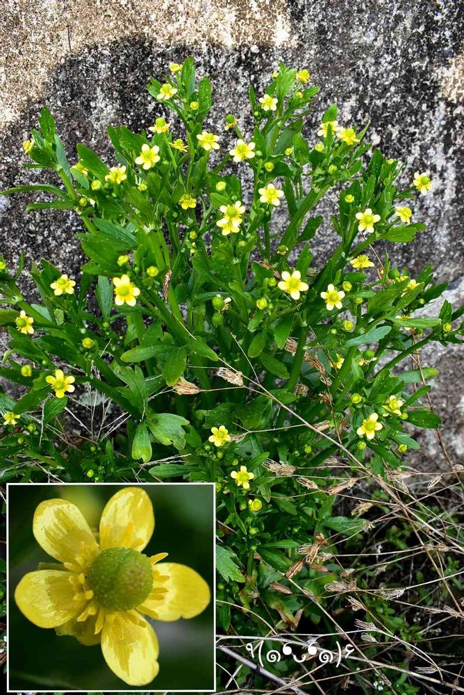 茎・葉・花に光沢が有ります。葉は腎円形で深く3裂し、裂片がさらに細かく裂け、根生葉は長い柄が有ります。