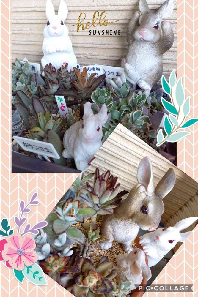 初登場の仲良しウサチャンファミリーにお手伝いしてもらい、カランコエプランターとうさ耳専用鉢にお邪魔してます😊