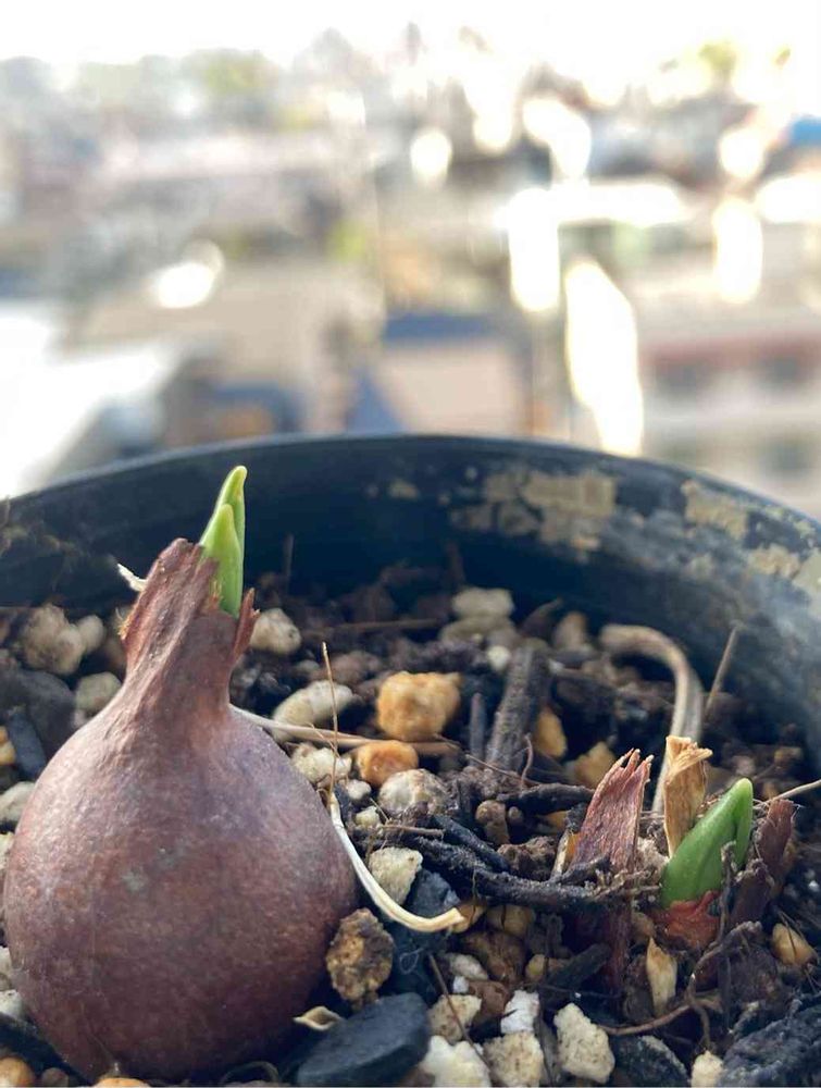 昨日ベランダの掃除してたら球根から芽が出てました😮