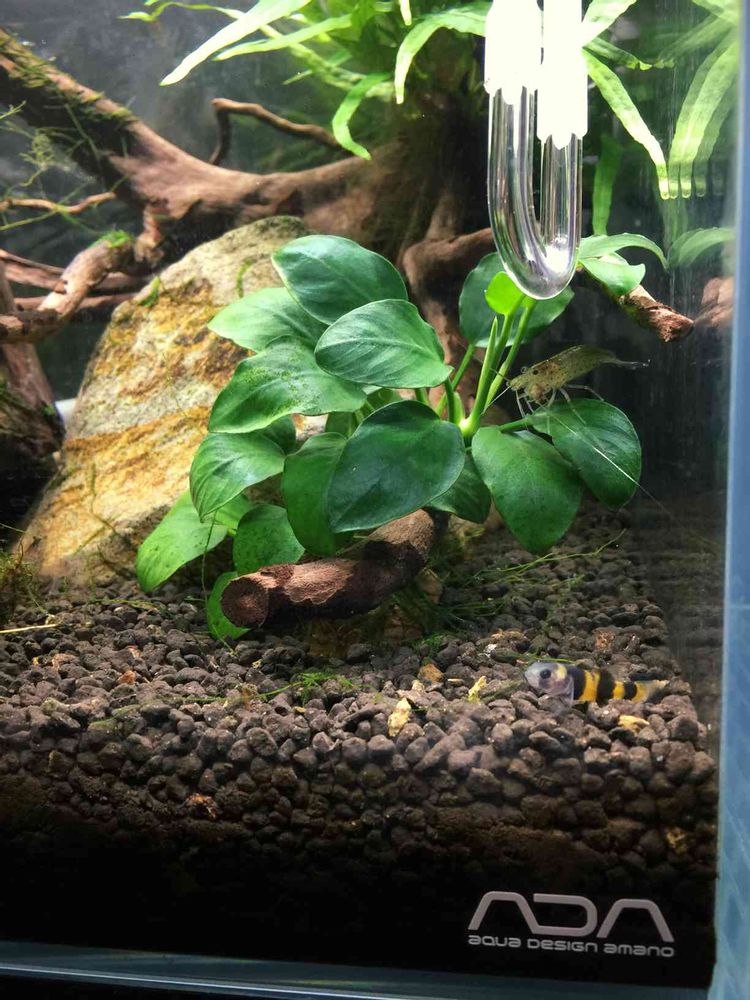 アヌビアス・ナナもミクロソリウムもいいグリーンです。手前の魚はバンブルビー・ゴビー。ハゼの仲間です。