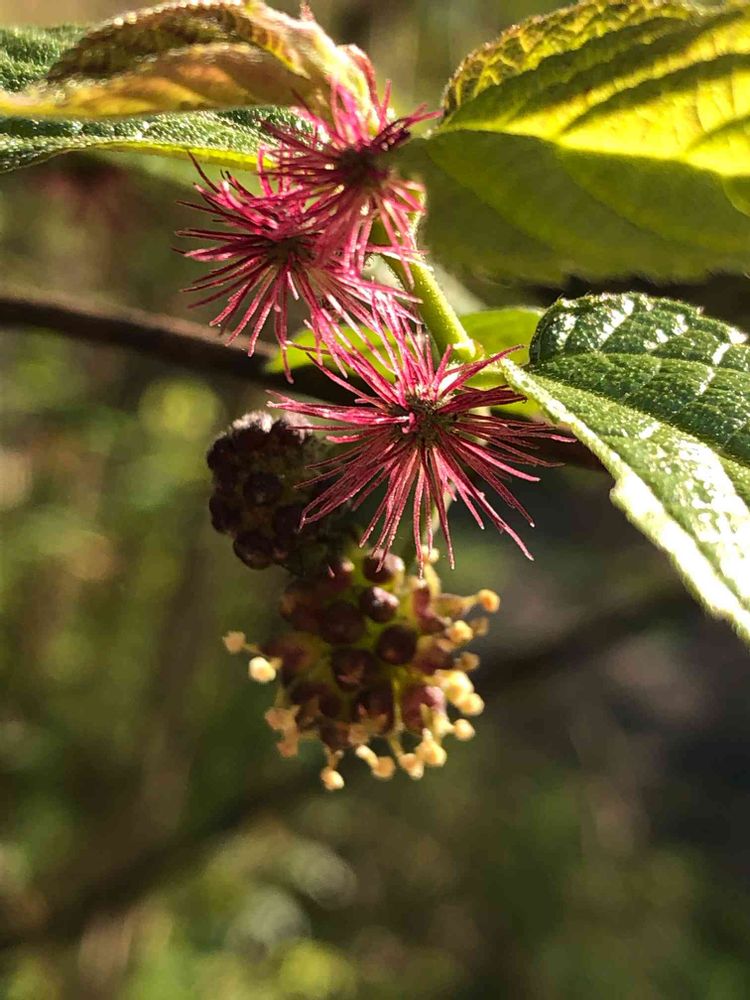 雌花序は糸状の赤いおしべがつき出ていて面白い。