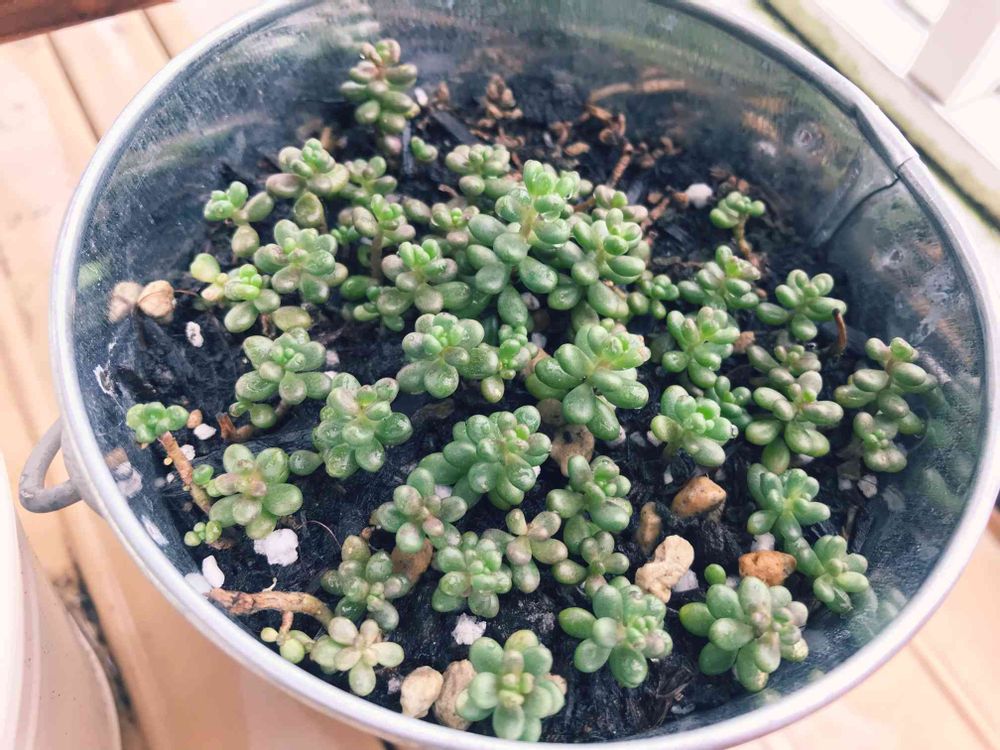おはようございます😃続いてた雨が上がった隙にベランダへ🌟ポイポイバケツに入れてたセダムが根付いたみたいです。雨のお陰でぷりぷりしてる!