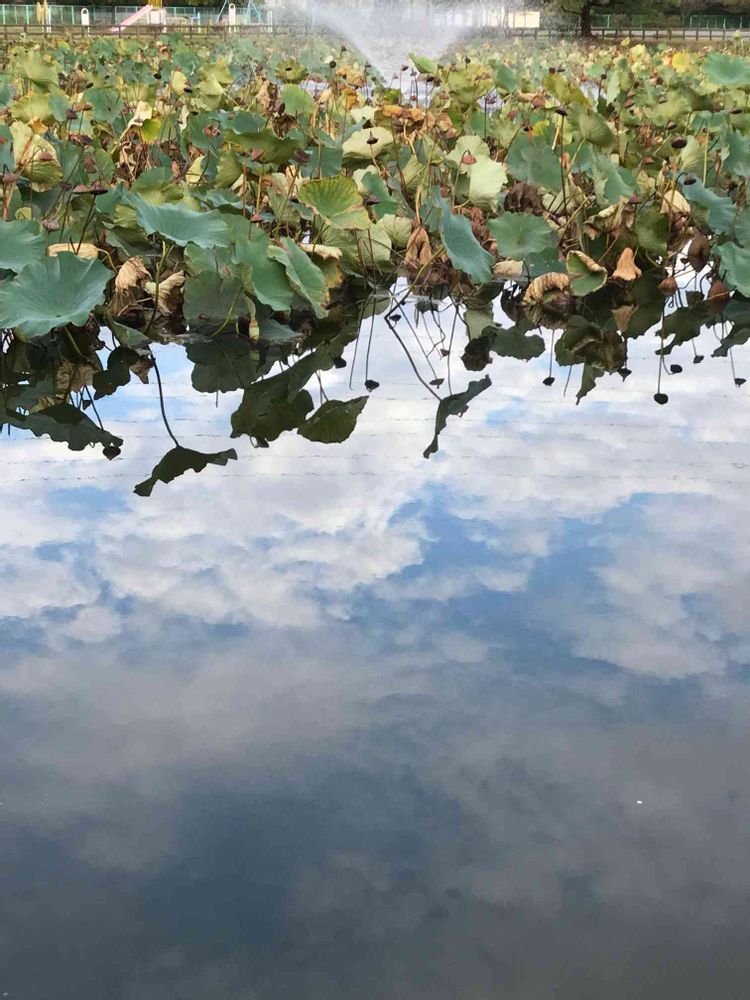 ハスのお池に映っているのを見て、ぁら、雲がだいぶ切れて青空が出て来ています❣️