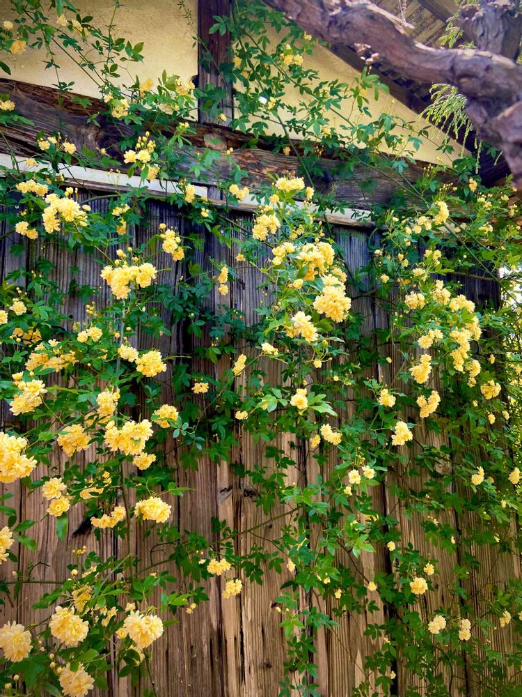 黄木香薔薇 かなり自由に育てているのですが 北側に伸びていった枝は他の木の邪魔にならない様に誘引してます💦