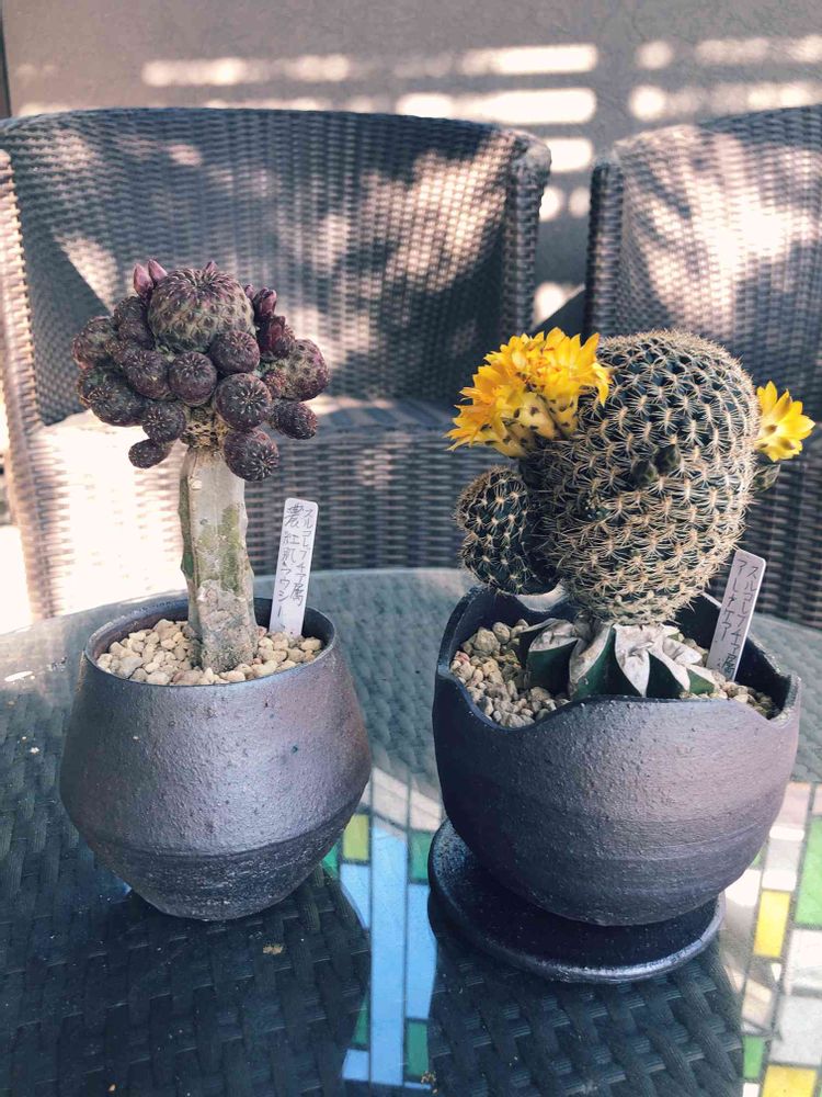 接木サボテンを小石原焼の植木鉢に植え替えしてみました。