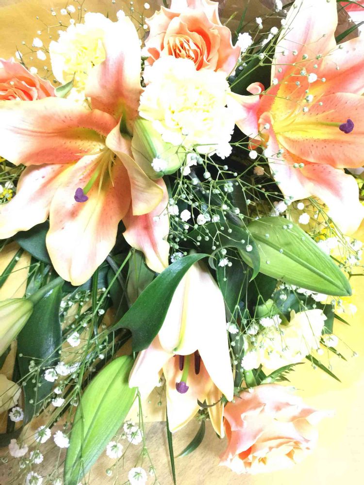 色合い、ボリューム、花もちの良さ…。細かく伝えたので、イメージぴったりでした。バラとユリの名前をレシートの裏にメモしてもらいました笑。