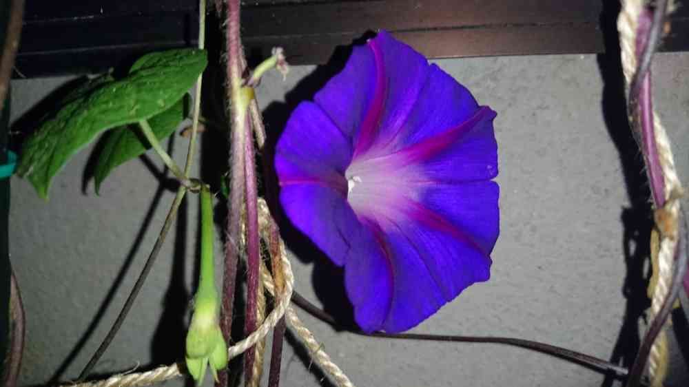 夜も咲き続けるあさがお…調べてみると西洋あさがおや琉球あさがおは夜まで咲くらしい…