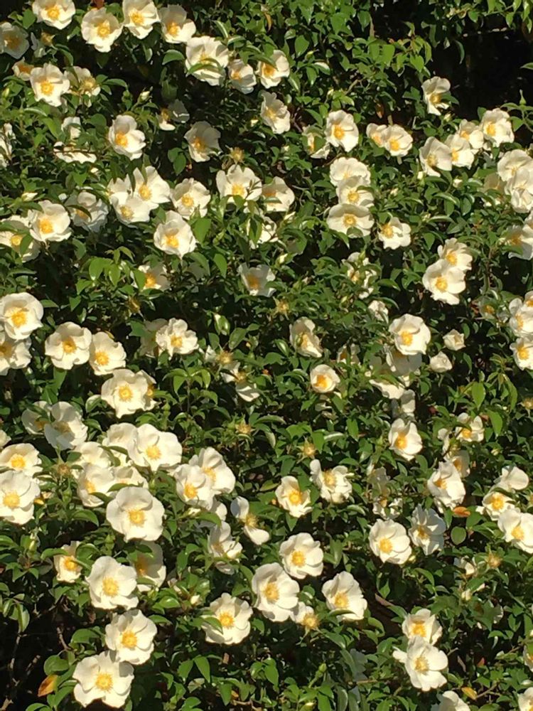 ピアノの先生のお宅の前。毎年見事なナニワノイバラが2階まで満開。