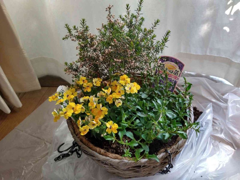 ハンギングバスケットの寄せ植えを植え替えしました。