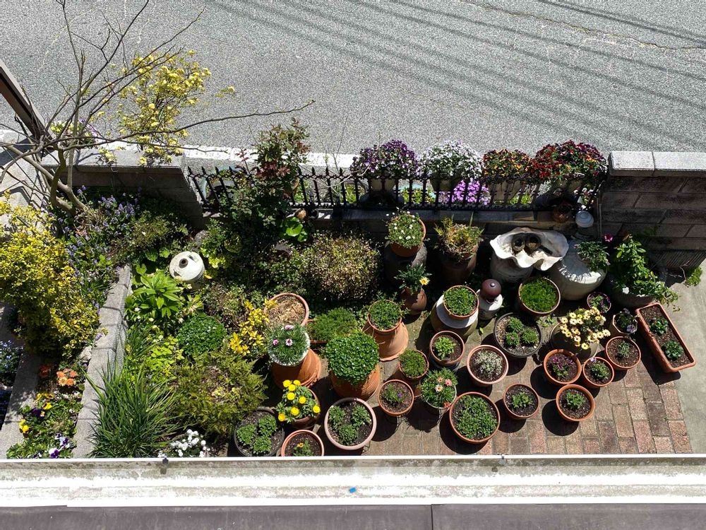 2階のベランダから撮った晴れ舞台を待って育成中と弱り始めた花達の待機場所です。