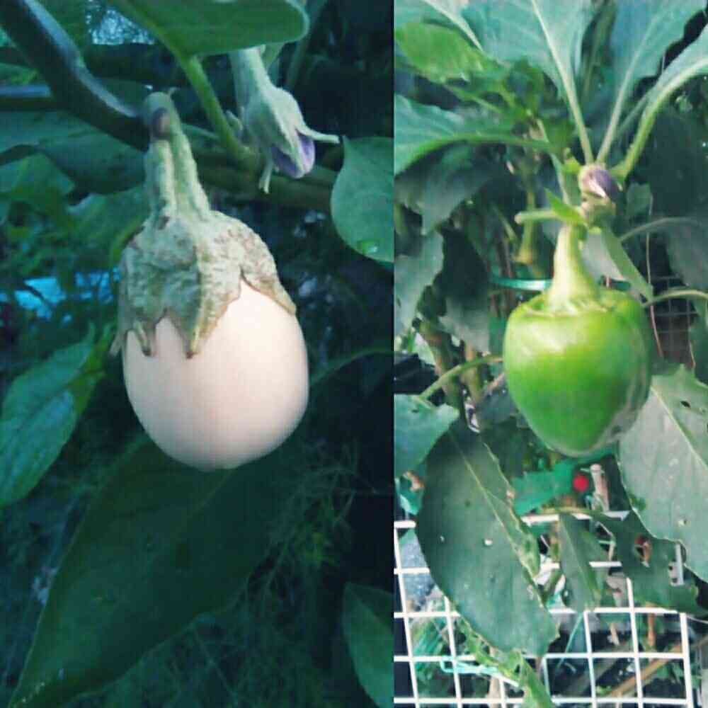 玄関前の放置されたプランターに、白ナスとピーマンが実ってました(笑)