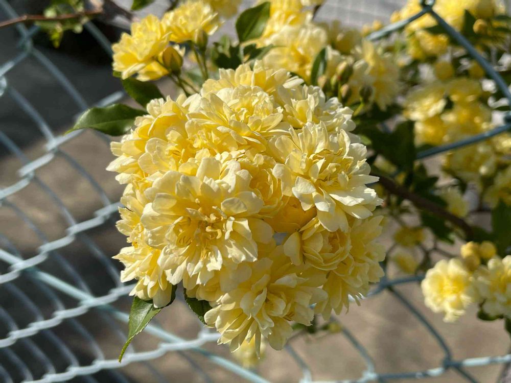 奥さん実家のフェンス側に植えたモッコウバラが綺麗に咲きました!