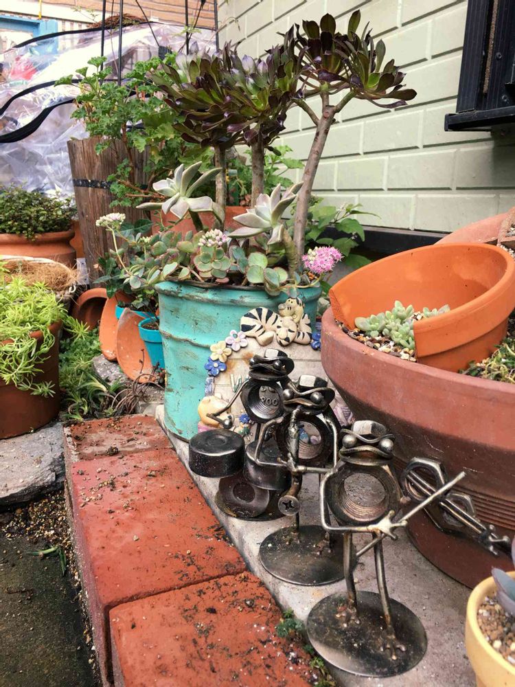 こんにちは🤗🐸ブラザーズ元気だよ〜ちょっと錆びちゃったけど💔軒下に入り切らない🌿🍀達は