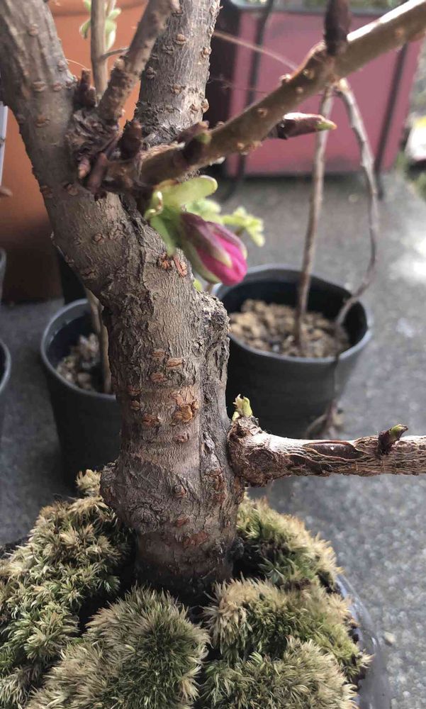 旭山桜の盆栽。今年は花を諦めていましたが、蕾が3つ程確認できました❁.*・゚