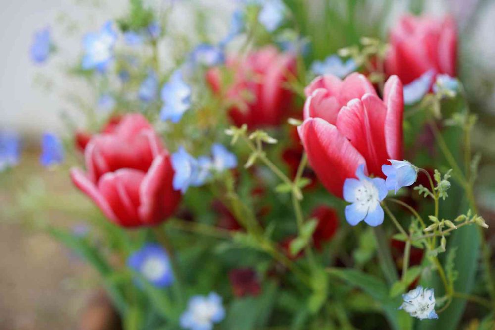 赤いチューリップと青い花のコントラストが素敵です。🔰ですので勉強させて頂きます!