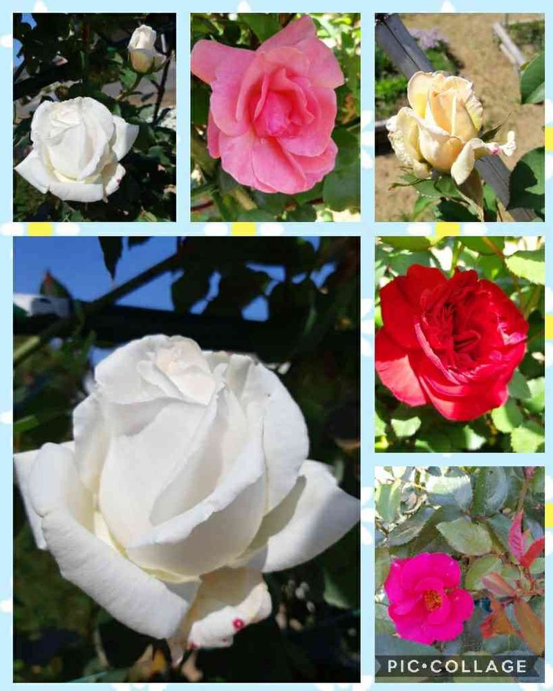 おはよう👋😆✨☀️ございます。2枚目です😌💓。お多福ガーデンの、薔薇🌹です😌💓。黄色は、グラハムトーマス。赤は、フロンティーナ。ピンクは、、エリザベス、プレーガ-ル。白は、ホワイトクリスマス、生クリームみたいな、アイスクリームみたいな綺麗な薔薇🌹です😌💓。昨日ガーデン午後に、なって薔薇🌹が、開き初めました❗✌💖💖🎵。