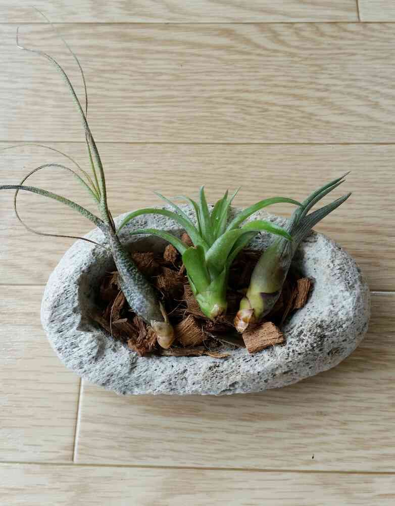 緑葉種3人組はお花屋さんの2階で見つけた軽石の鉢に置かれることになりました。わが家でタワシに乗っていないのはこの人たちだけです。