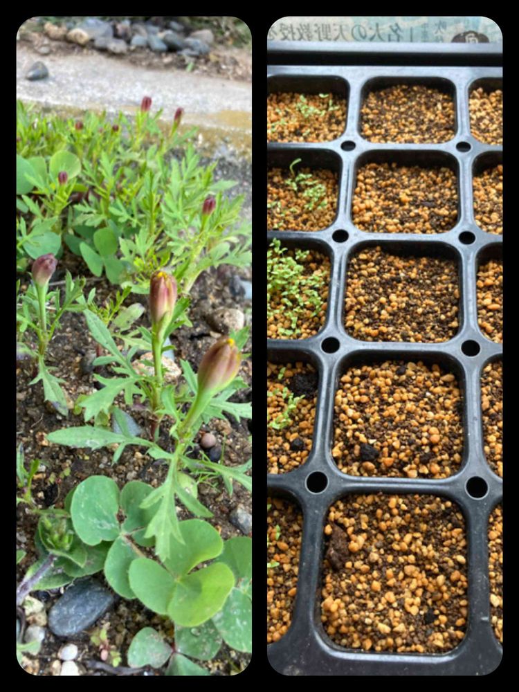 お部屋の中で見守ってるマリーゴールドの種まきした列は、2週間ほど経ったけど、芽が出てくる様子もなく、変化ないのに…。お庭の片隅で、自然に任せて、冬を越したこぼれ種達は、蕾をつけているなんて‼️🌱種まきした意味なーい(笑)😂