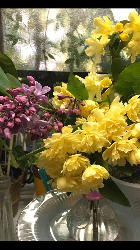 お庭で咲いてた、黄モッコウバラさんとカロライナジャスミンさんとライラックさんをキッチンの窓辺に飾りました^_^♡♡♡