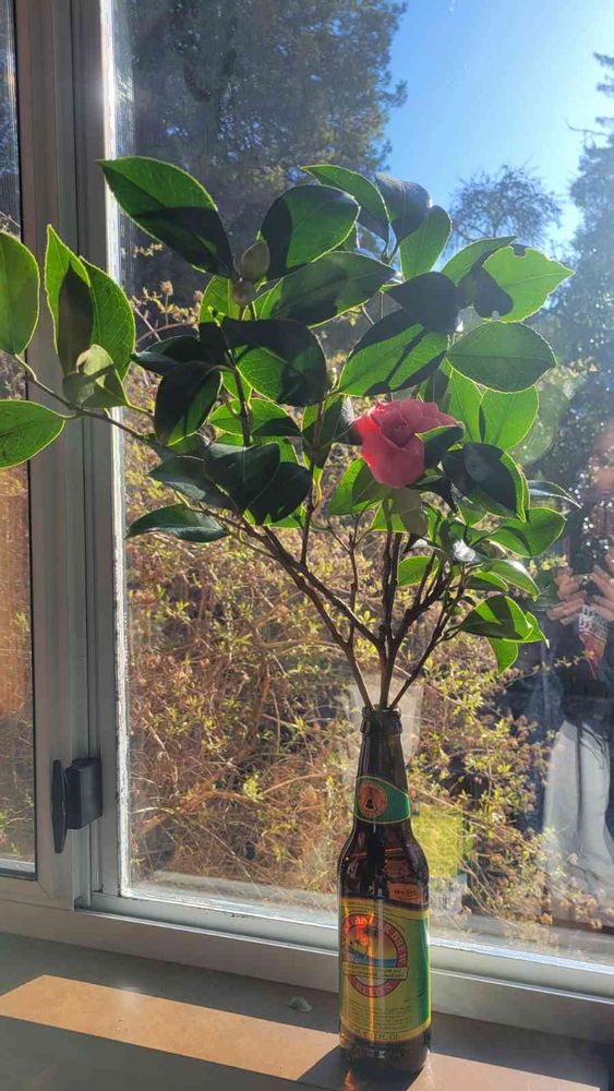 カメリアの手入れをしていて、蕾のついた枝、蕾も小さくて開くのか疑問だったのですが、ダメもとで切り花に。