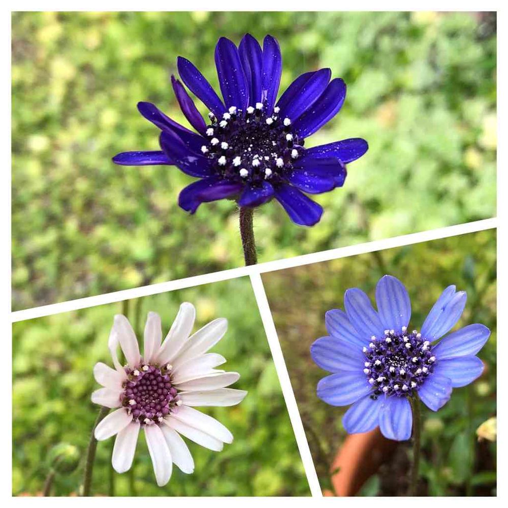 いしゅんちゃんから種をもらったフェリシア、可愛い3色が咲いたよー❀.(*´▽`*)❀.