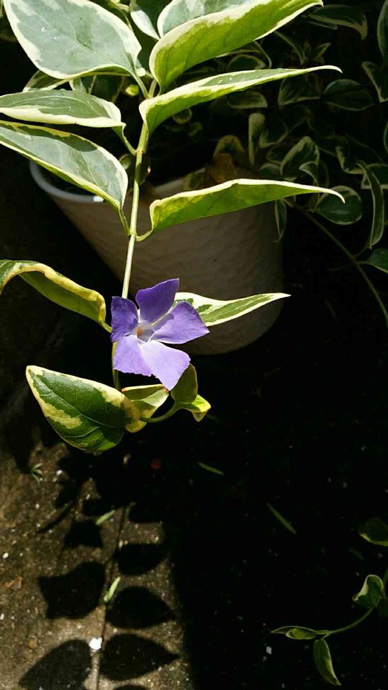 斑入りの葉っぱのツルニチニチソウ紫色の花付きました