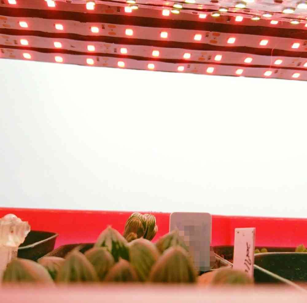 光の成分にある色の部分の赤の660nm成分に着目。あとは同量の白光源(使ったのは、3色の合成色らしい)を追加しています。10センチ平方に50チップをセットしましたが、暗いので高さ間隔が5〜7センチくらいです。今後は420nm成分の紫外線にも範囲を広げて、ミニ植物工場に?