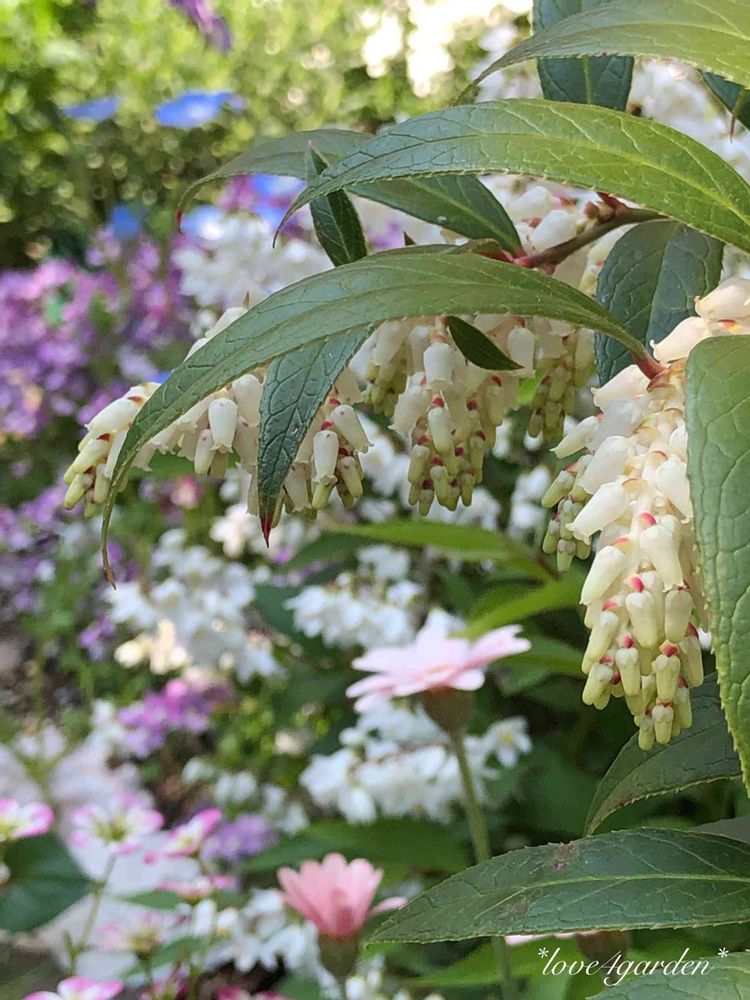 アセビのおはながパステルカラーのお花達の間で、ユラユラ揺れているようです✨🎶💕可愛いですネェ😄