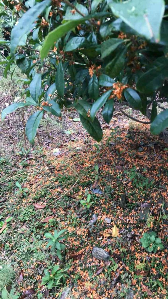 雨で金木犀のお花が殆ど散りました。山吹色の絨毯。