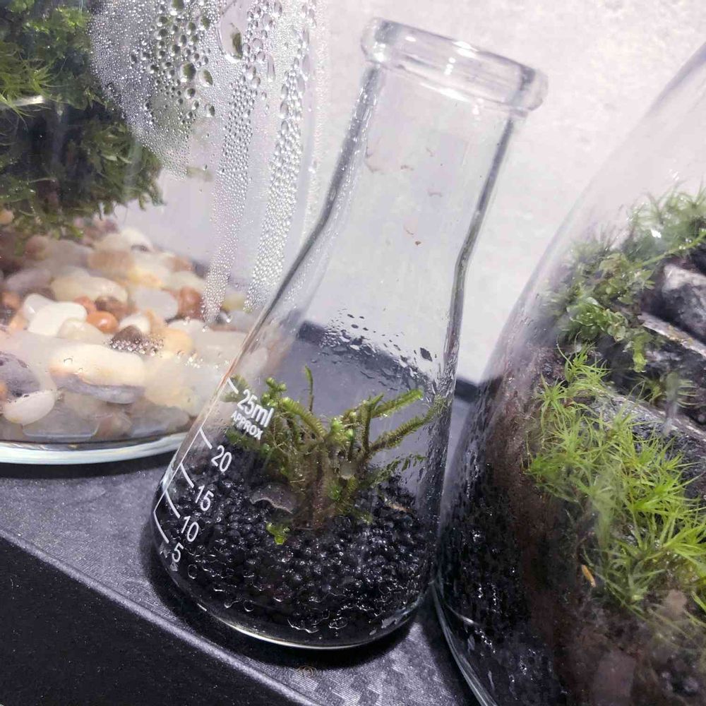 昔ダイソーで買った小さいフラスコにムチゴケちゃん植えた。上部開放だから湿度保ちつつ匍匐性の苔が徒長しにくいんじゃないかな?と期待してる。コツボゴケとかも試したいからこのフラスコもっと欲しいけど今うちの近くの店に置いてないの悲しい。