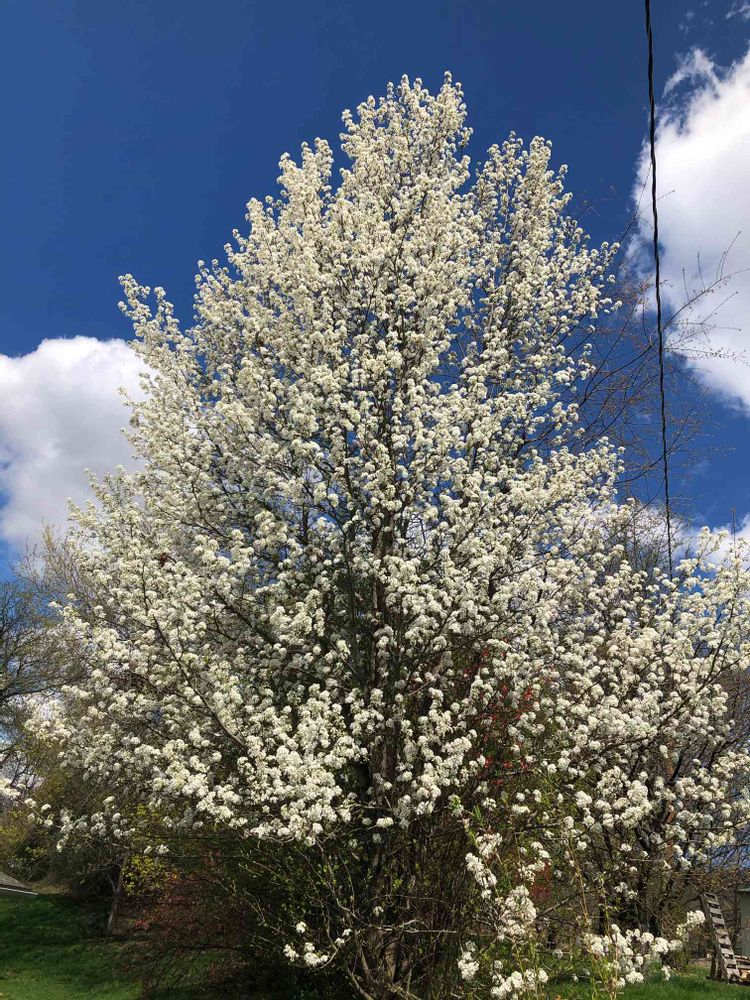 Flowering pear tree です❣️電線が横にあるのが残念ですが、うちに来てる電気なので文句言えません😕