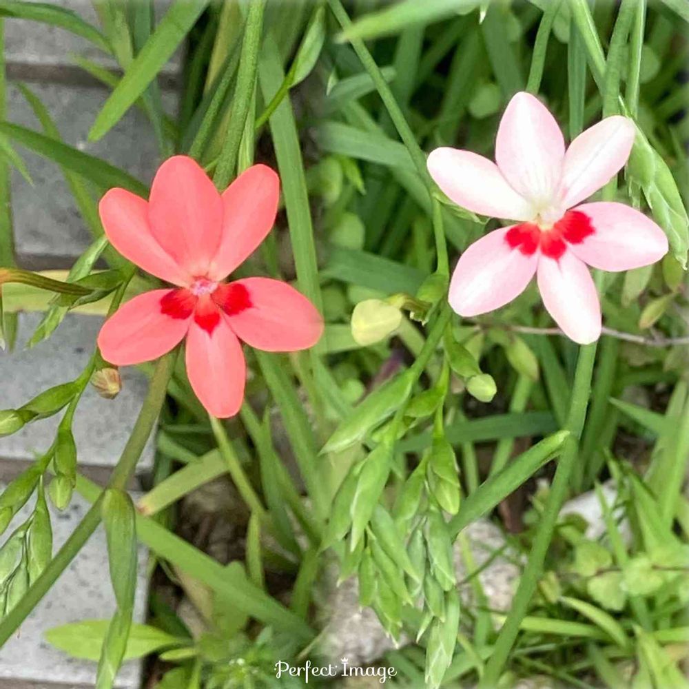 白花とサーモンピンク色の組み合わせです。中心の深い赤が基本種。