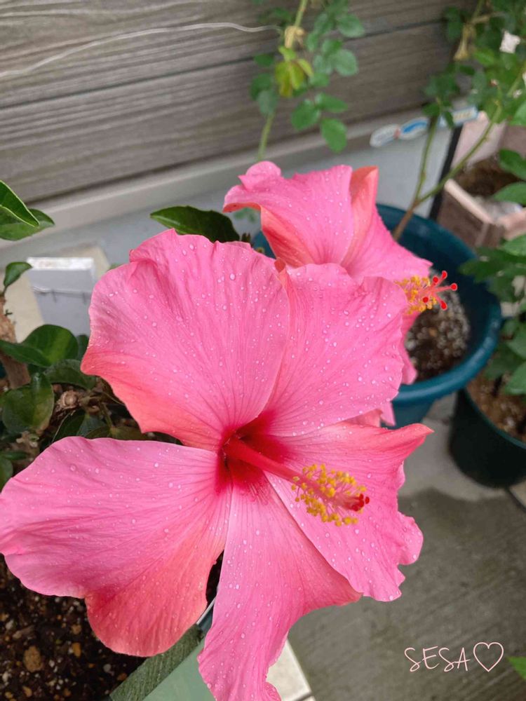 雨の中、とてもキラキラしたお花を見せてくれているハイビスカス です🌸💕冬越しして、我が家で一番最初に咲いてくれました♪