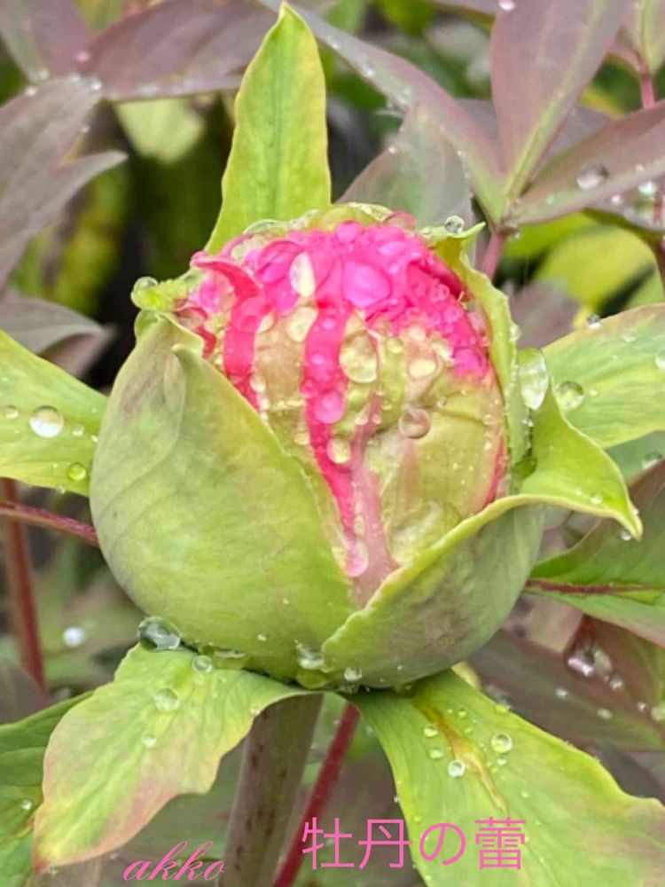 雨の中玄関前の、牡丹の蕾が膨らんできました❣️