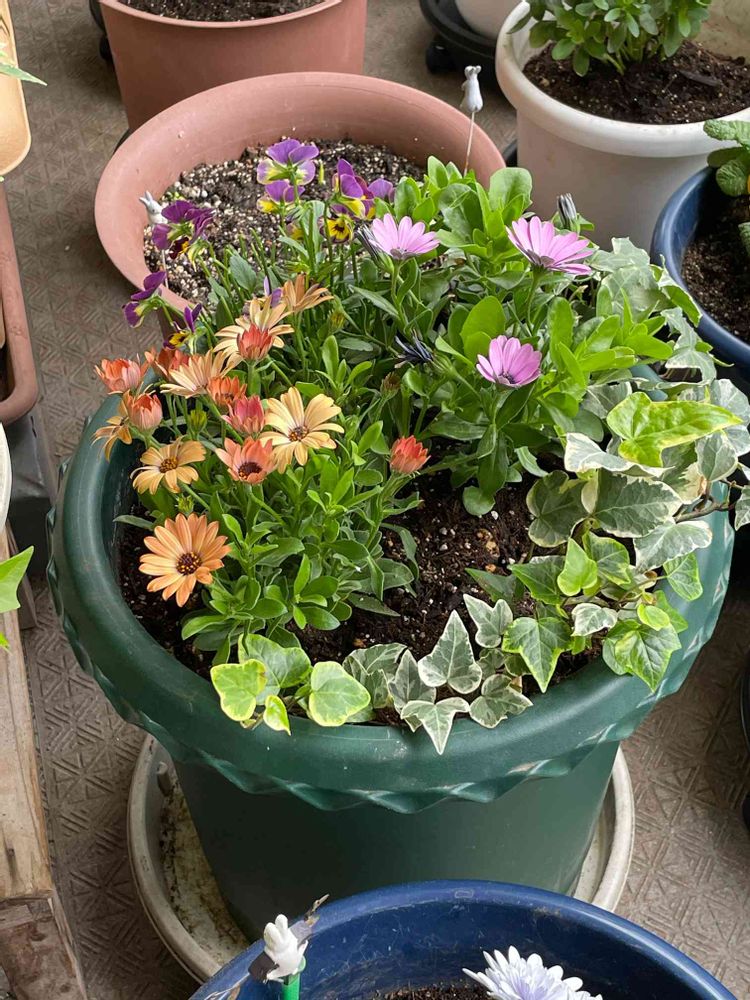 ビオラとアイビーの中に入れたオスティオスペルマム頑張ってます。