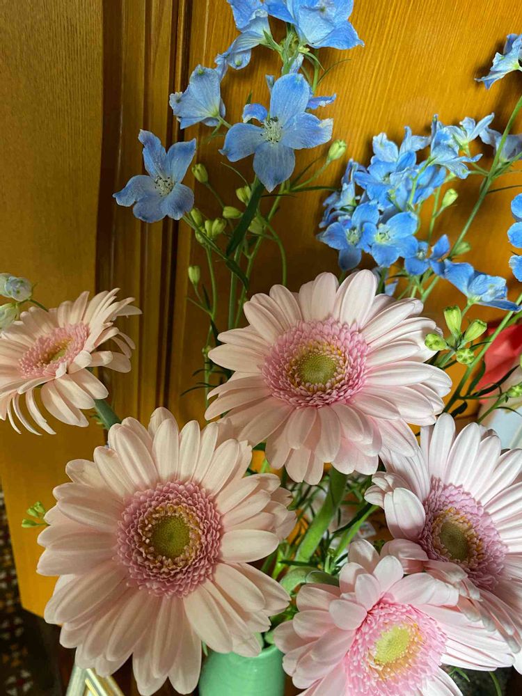 お花屋さんで水色が可愛かったのでそれに合わせてピンクのガーベラ