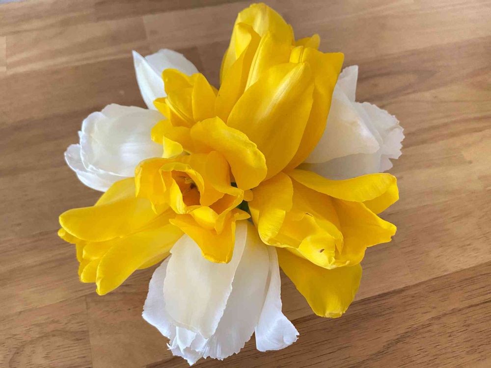 昨日の雨で赤は花びらが散ってしまい、少し遅れて咲いた黄色と白も茎が曲がってしまいました。