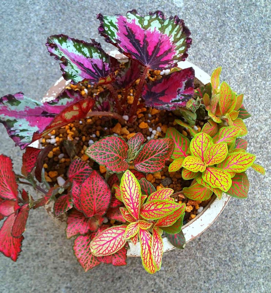 フィットニアとレックスベゴニアの派手な色合いの寄せ植えになりました😁✨✨