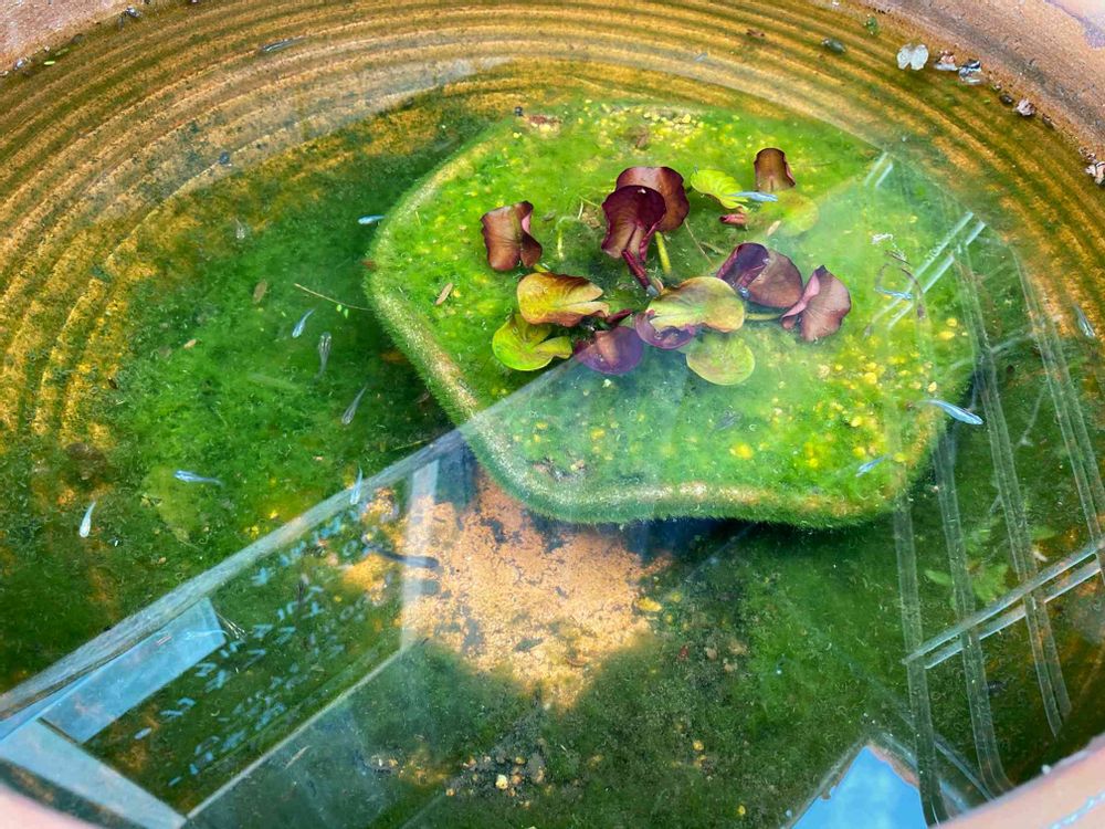 2021.04.14 知り合いのカフェに行く用事がありまして足を運ぶと睡蓮が葉っぱを付けてました。聞くともう何年も掃除もせずに手を加えていないとのこと。睡蓮鉢と藻がとても美しく仕上がっていて、それでいて水も澄んでいて綺麗でした。私も上手に育てたいと思います。