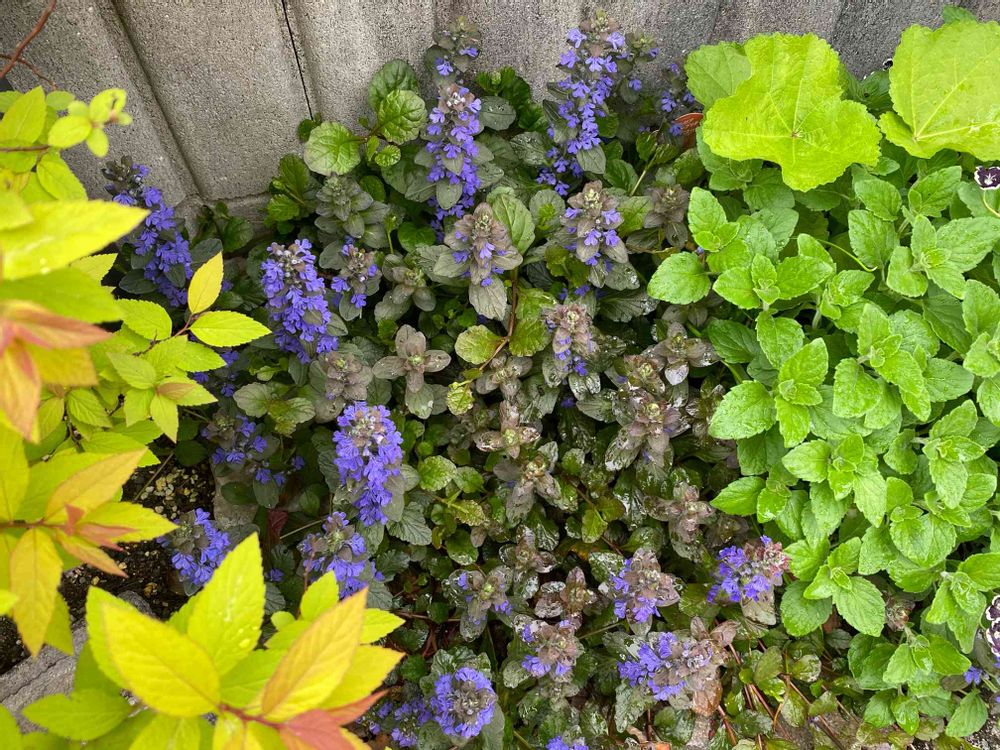 この季節、黄色い葉っぱが鮮やかなシモツケ・ゴールドフレームの下に、アジュガのお花が咲いてきました💜