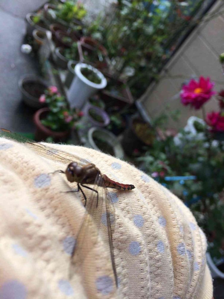 赤トンボさん、私の左腕に留まったまま動きません。