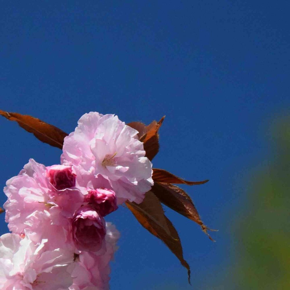 【研究学園の花々】2021年4月10日、研究学園駅前公園の八重桜が見頃となり、真っ青な空、新緑をバックにエレガントに咲いていました!