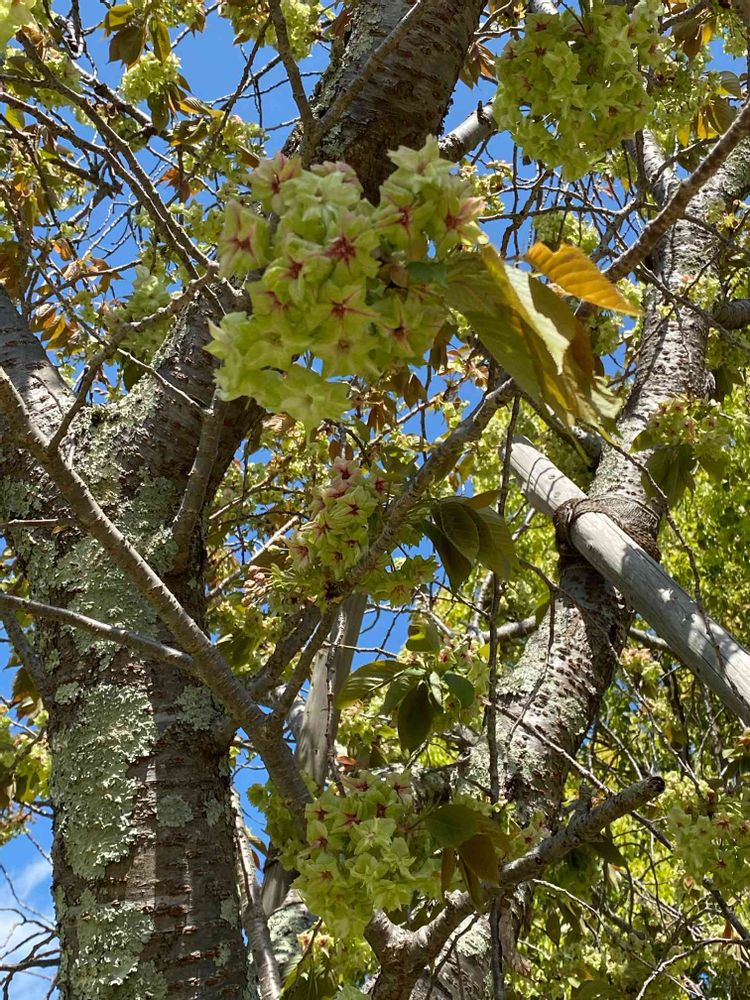 鬱金桜の方 開花、色めのリサーチしてきま〜す。綺麗な黄緑色の花房になっていてくれるとBEST❣️明日の気温⤴にも期待しつつですが。