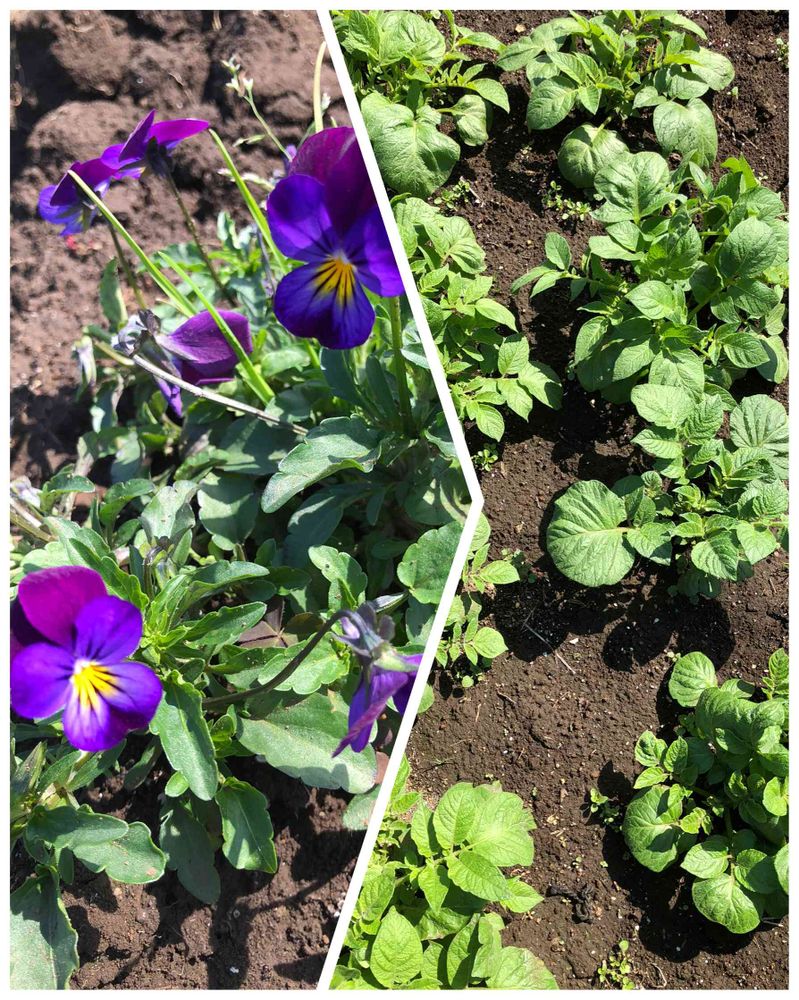 畑のじゃがいもの芽が🌱育ってきました。左のお花は、何処からか種が飛んできたのか、自然に生えてきたパンジーです。🍀🌱
